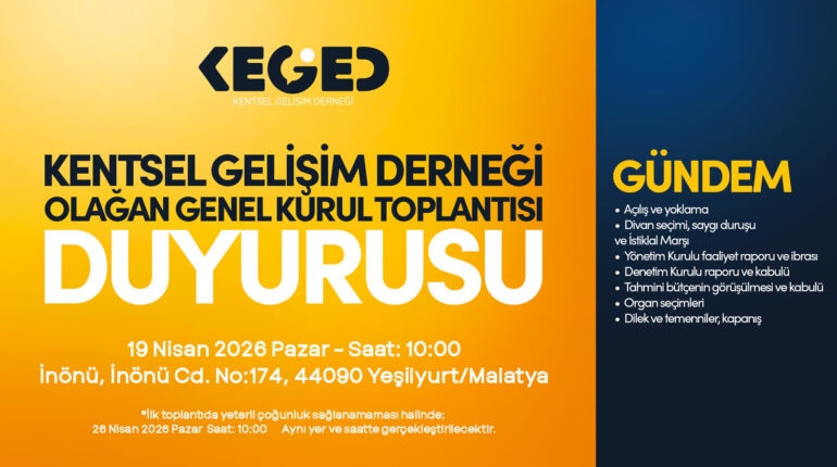 Derneğimizin Olağan Genel Kurul Toplantısı, Yönetim Kurulumuzun 30.03.2026 tarihli kararı doğrultusunda aşağıda belirtilen tarih, saat ve adreste gerçekleştirilecektir.
